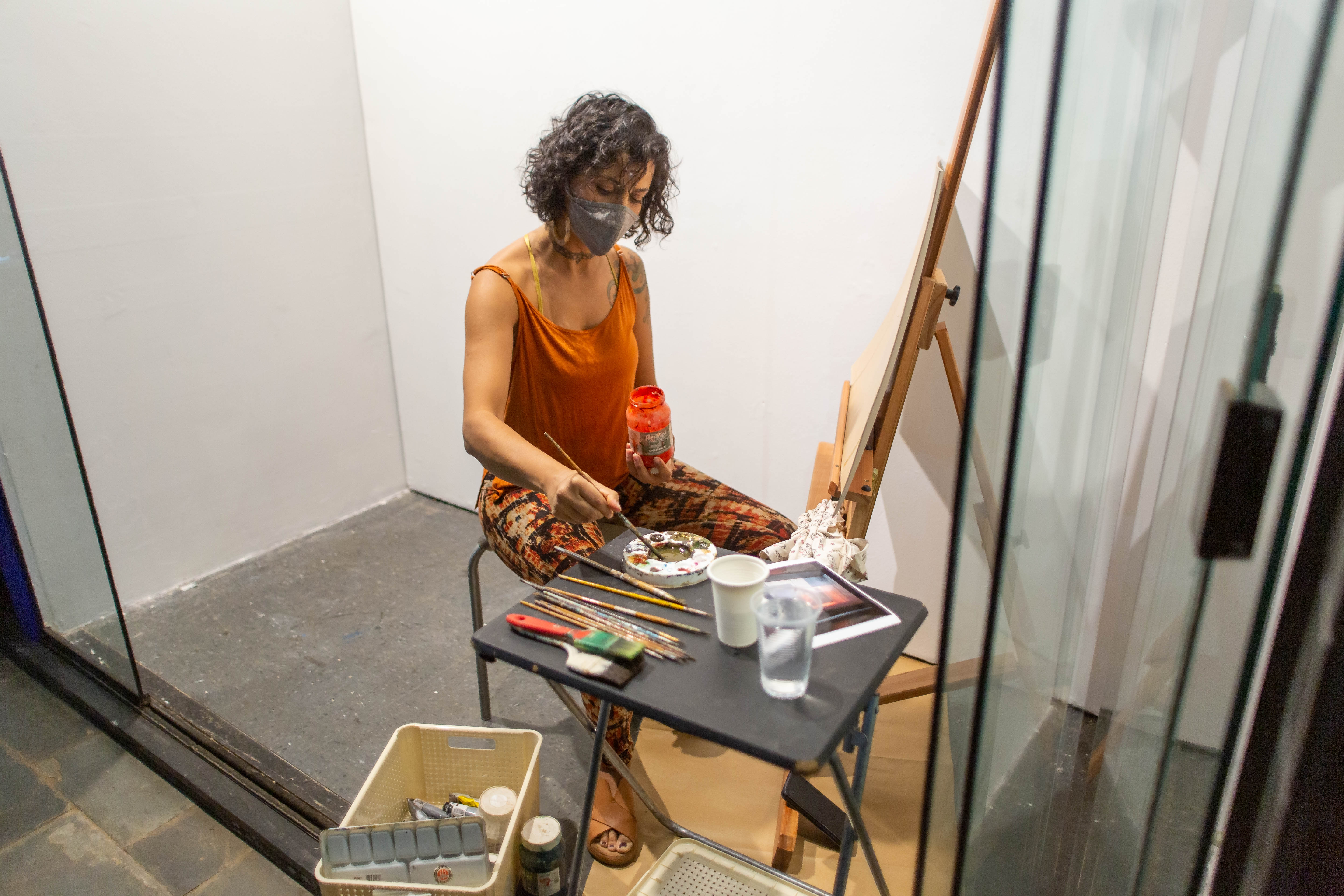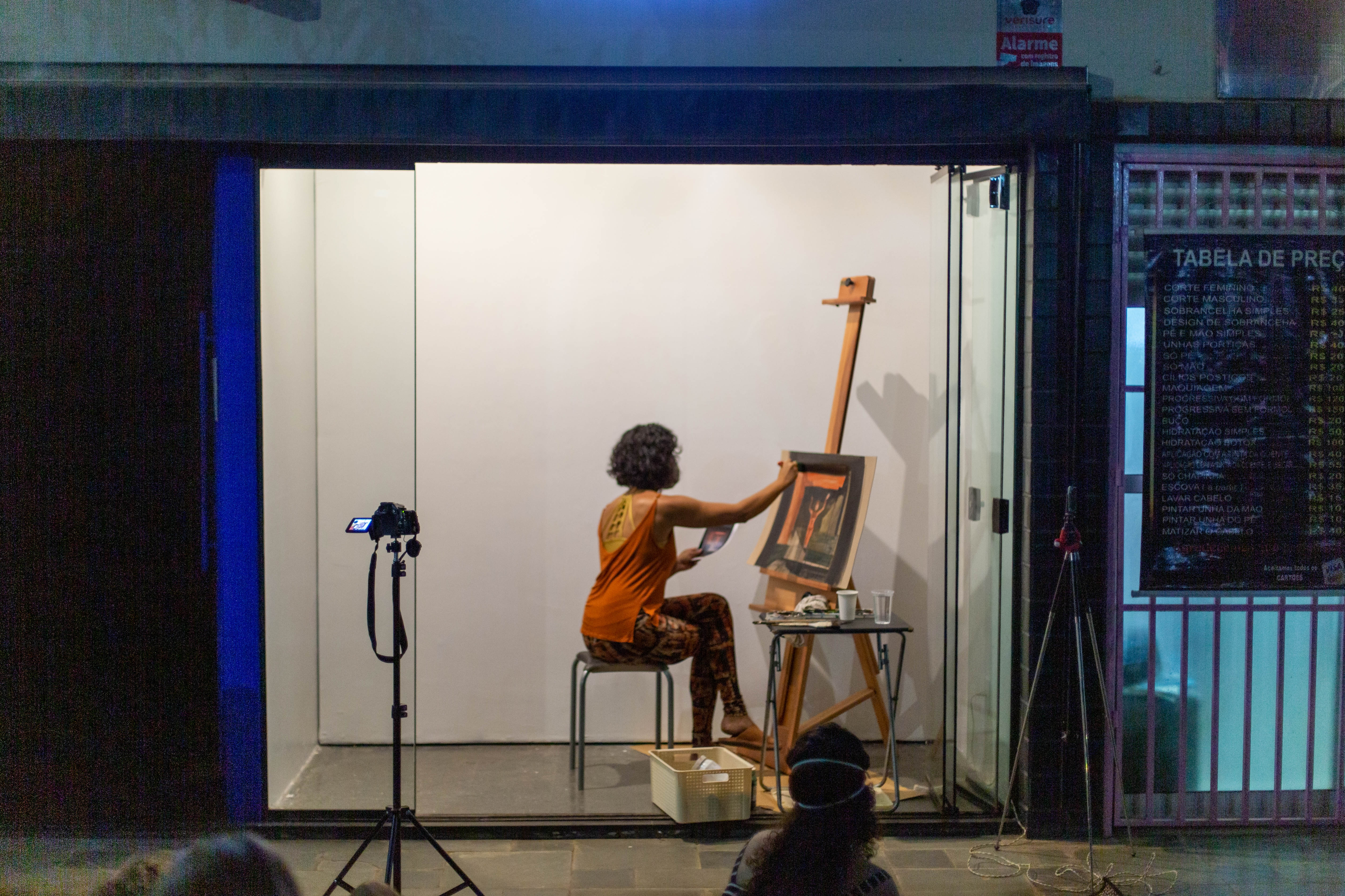 Ato II – Pintura ao vivo: o processo de pintura ao vivo é a obra. A artista presente é início, meio e fim da obra em processo. É objeto e elemento da pintura que será gerida durante o tempo instantâneo do olhar transado do/da transeunte e dos/das observadores/as da galeria à rua, da vitrine à tela do computador.